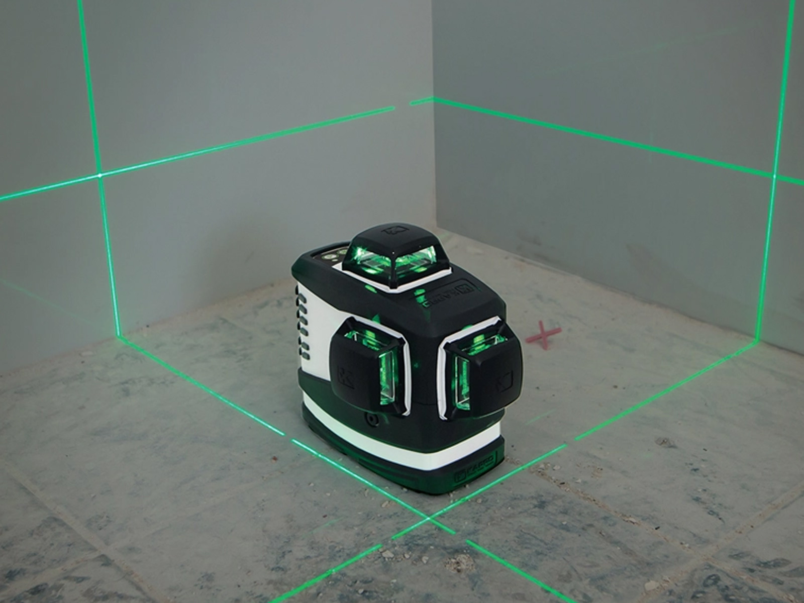 Hochpräziser Kreuzlinienlaser mit drei 360°-Laserlinien (horizontal und zwei orthogonale Vertikale), der Räume vollständig erfasst und exakte Ausrichtungen ermöglicht.
