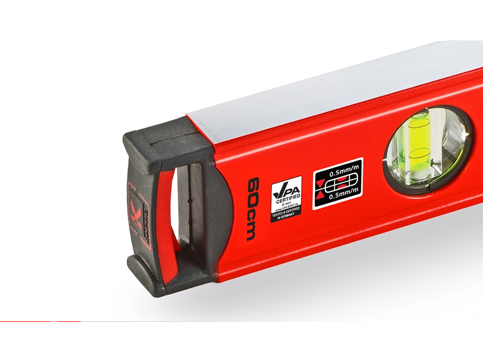 - Vergrößerte Horizontal-Libelle mit Gefälle-Markierungen bis 2 %