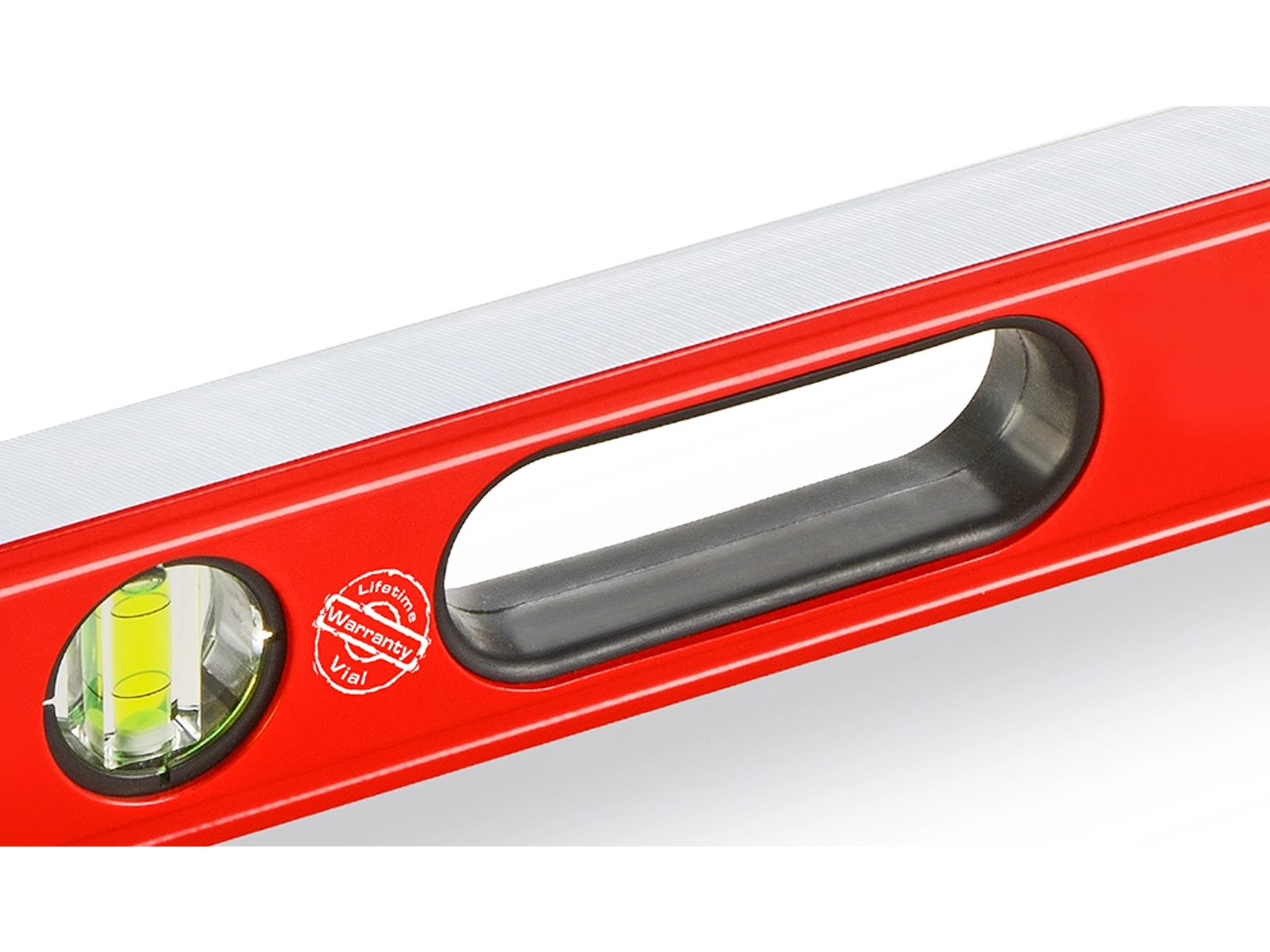 Präzise Box-Wasserwaage in 200 cm Länge und "Plumb Site® Dual-View" zum frontalen Ablesen der Senkrechten ohne Parallaxefehler. Die einseitig magnetische Ausführung haftet sicher auf Stahlprofilen und erleichtert freihändiges Arbeiten. Genauigkeit: ±0,5 mm/m.